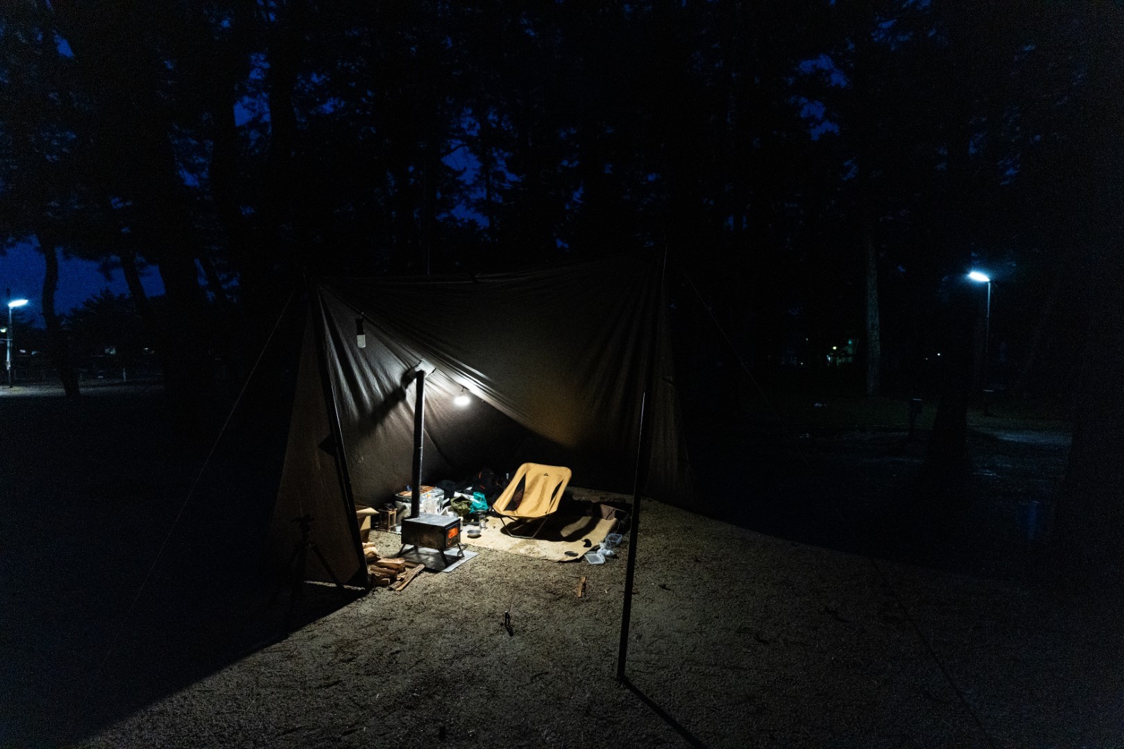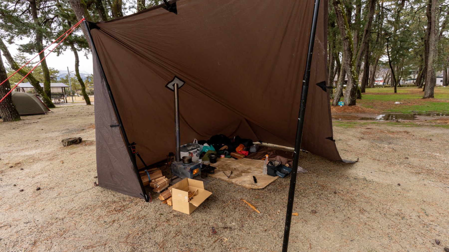 思っていたより寒さは厳しくなく、POMOLYの薪ストーブがタープ泊に安心を与えてくれます。とはいえ、冷たい風への対策は冬キャンプの鍵。