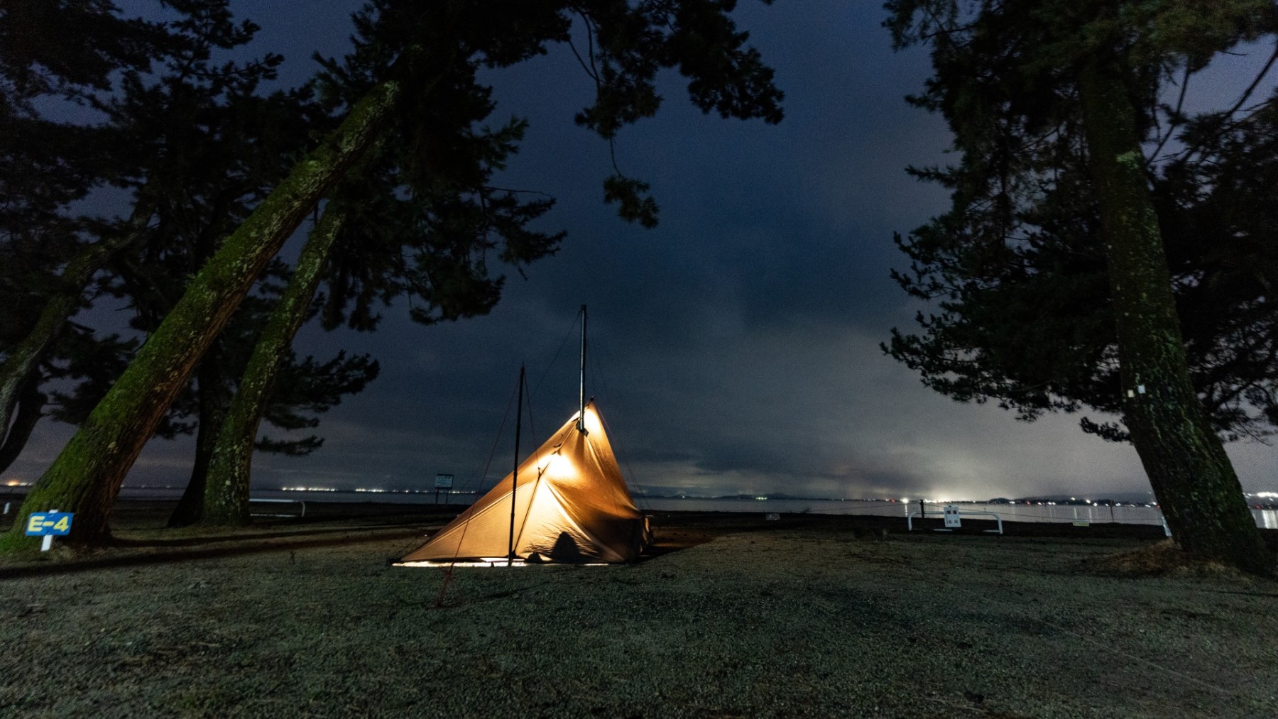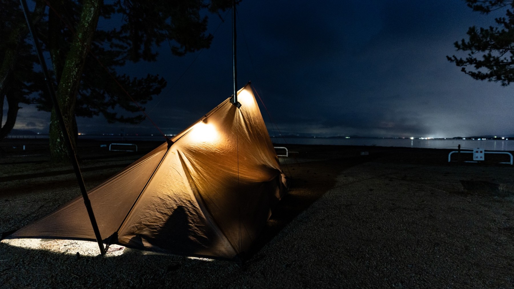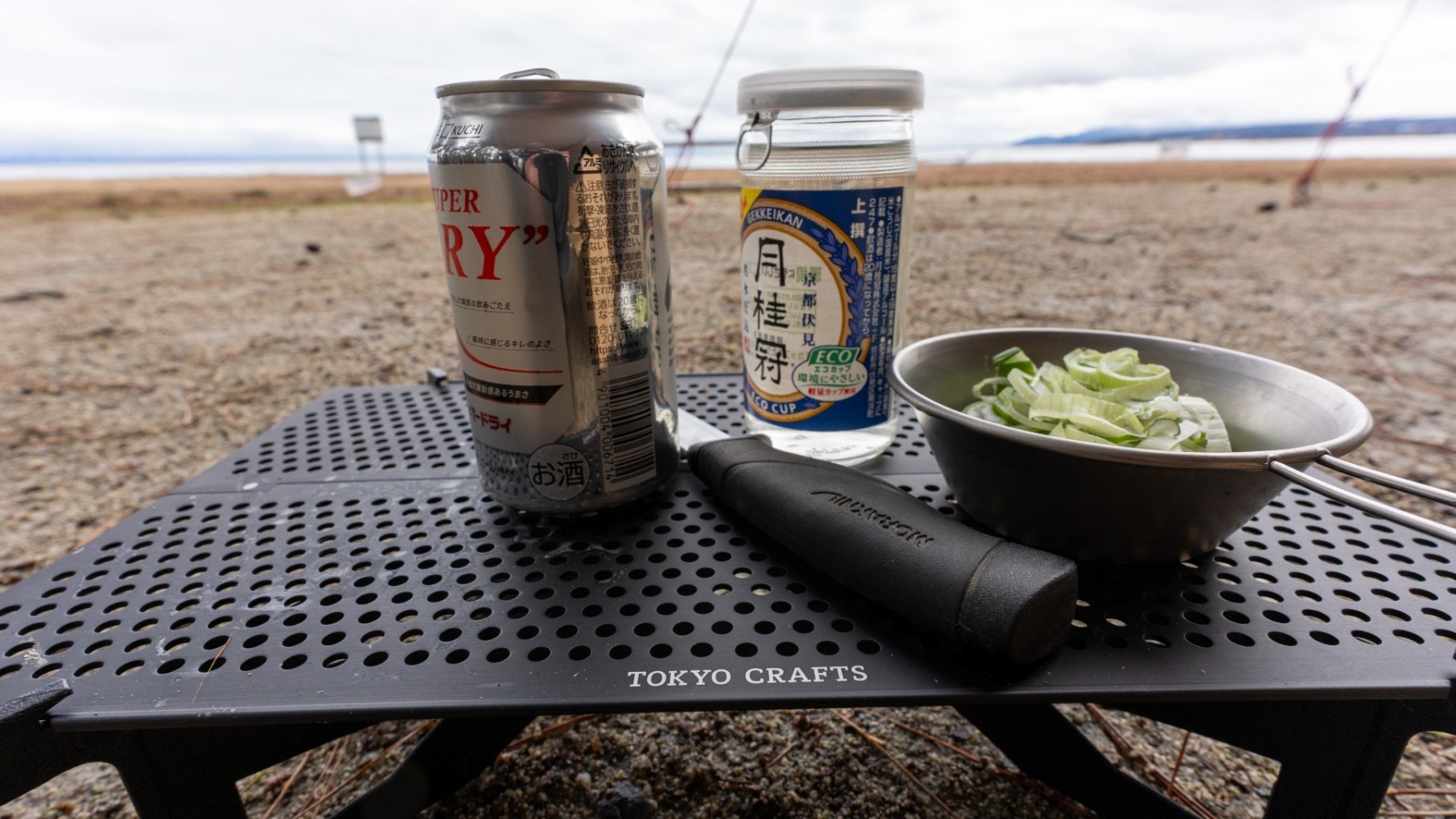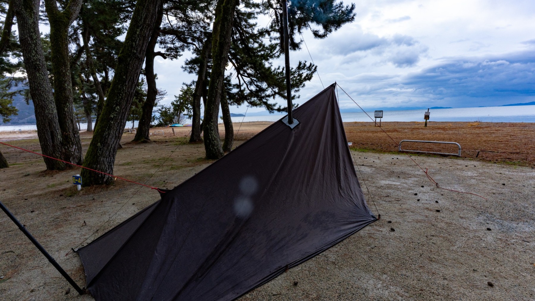 キャンプ地は静かな琵琶湖のほとり。天気はあいにくの雨模様でしたが、しっとりとした湖畔の雰囲気と冬の空気が心を落ち着かせてくれました。