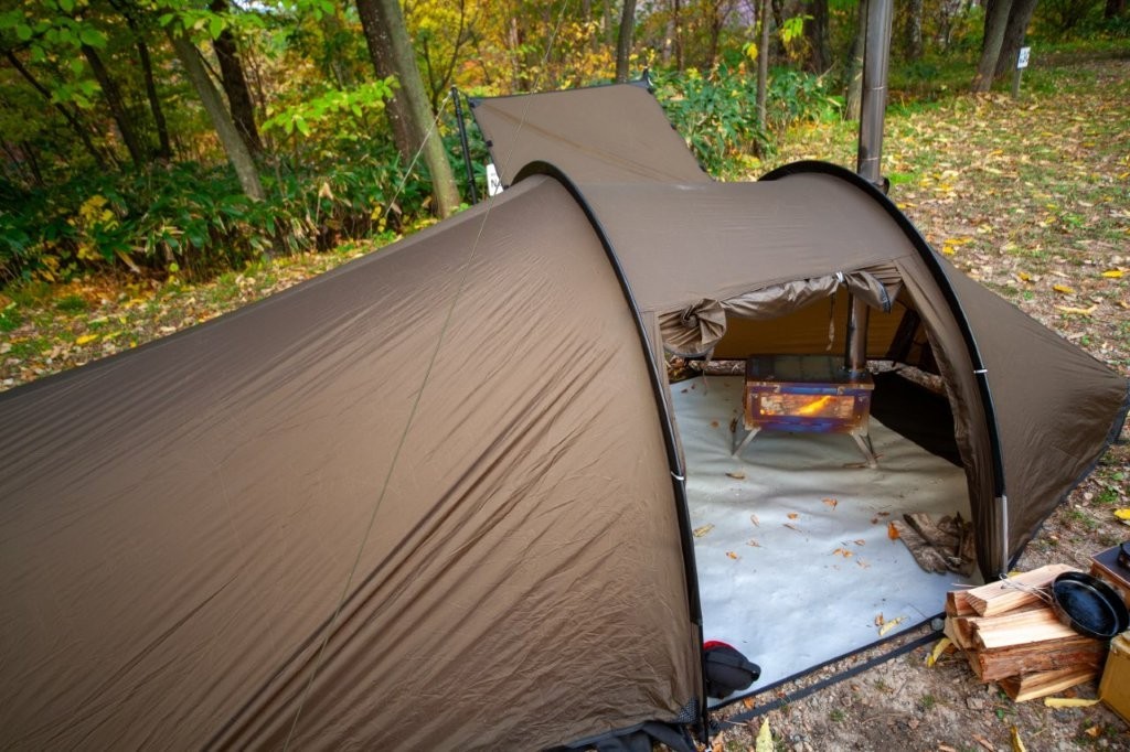 今回のキャンプでは、新しく導入したホットテント【POMOLY Locomotive 2】と、同じくPOMOLYのチタン薪ストーブを初めて使用。火を入れる瞬間のワクワク感、そしてストーブのやわらかなぬくもり…まさに秋キャンプの醍醐味です。