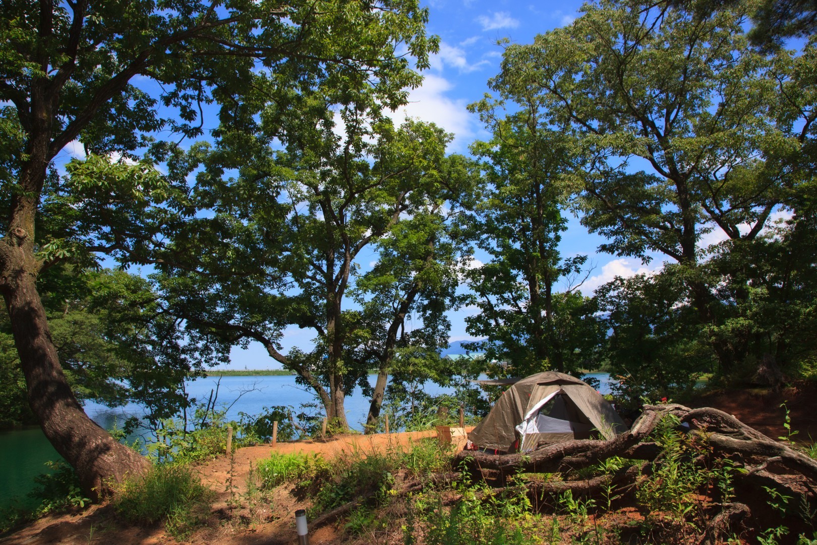 好きなサイトを自由に選び、湖畔にテントを設営。気温は36℃と猛暑日でしたが、時折吹く風が心地よく、美しい湖畔の景色に癒されながら過ごす夏のソロキャンプは、まさに至福の時間でした。