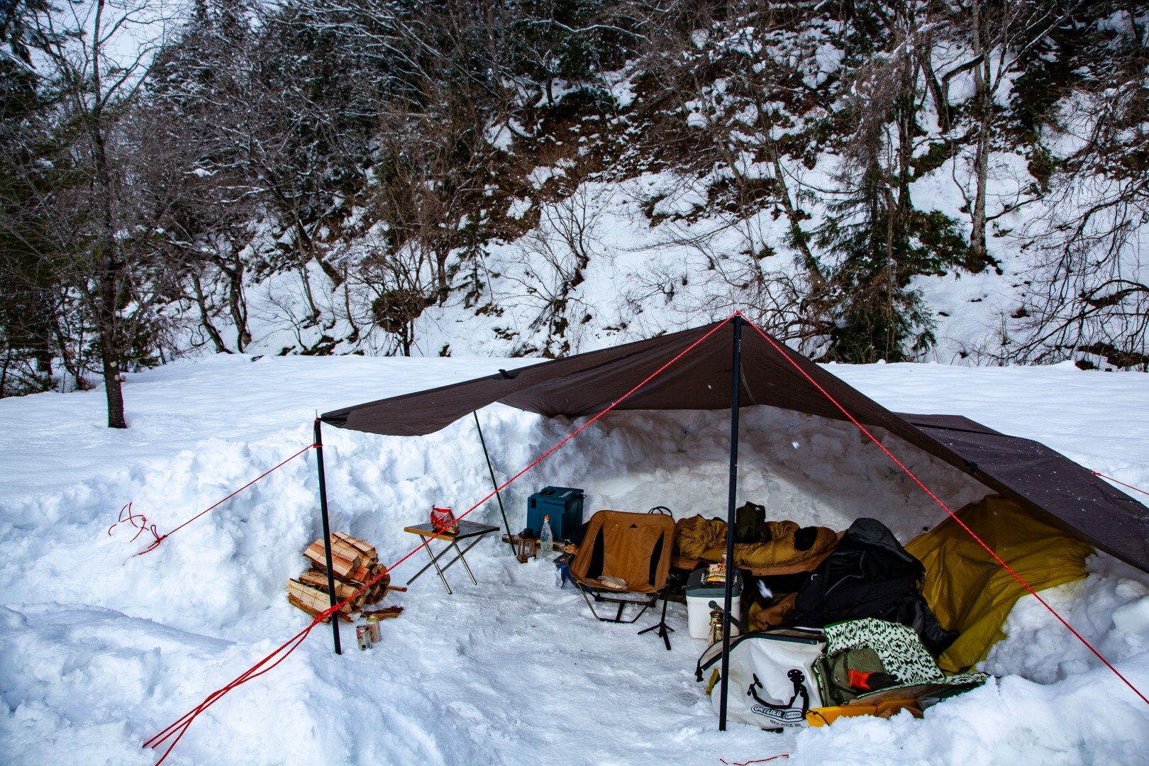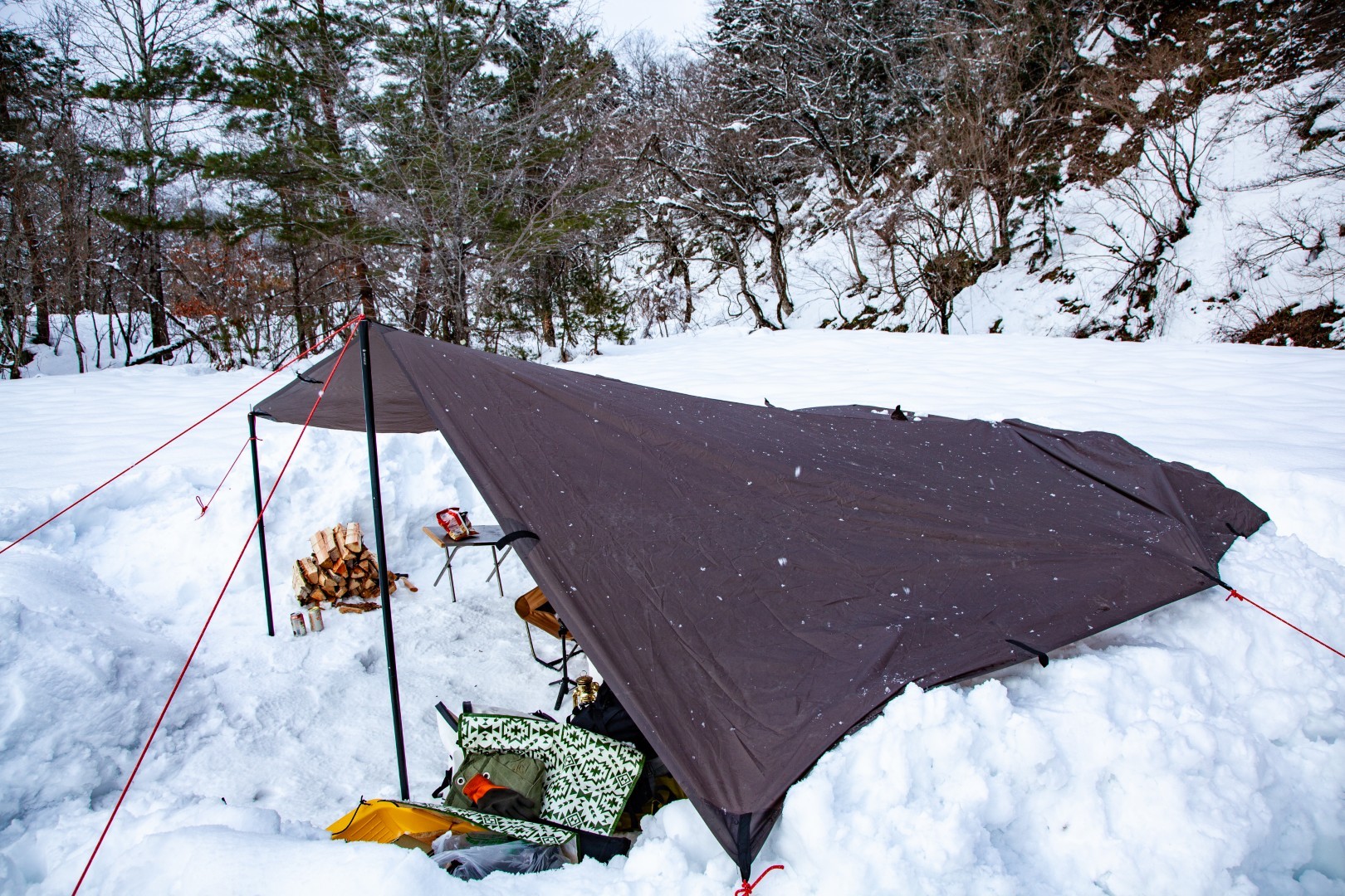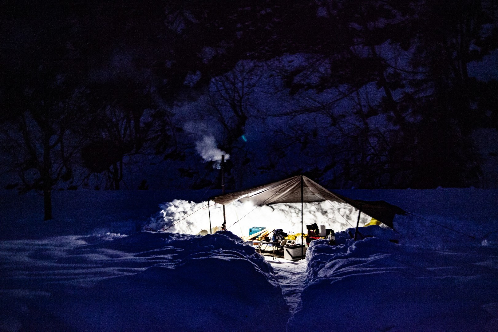 タープと半かまくらで作った寝床で過ごす一夜、薪ストーブの温もり、日本酒とキャンプ飯…冬ならではの静けさと絶景が心に沁みました。