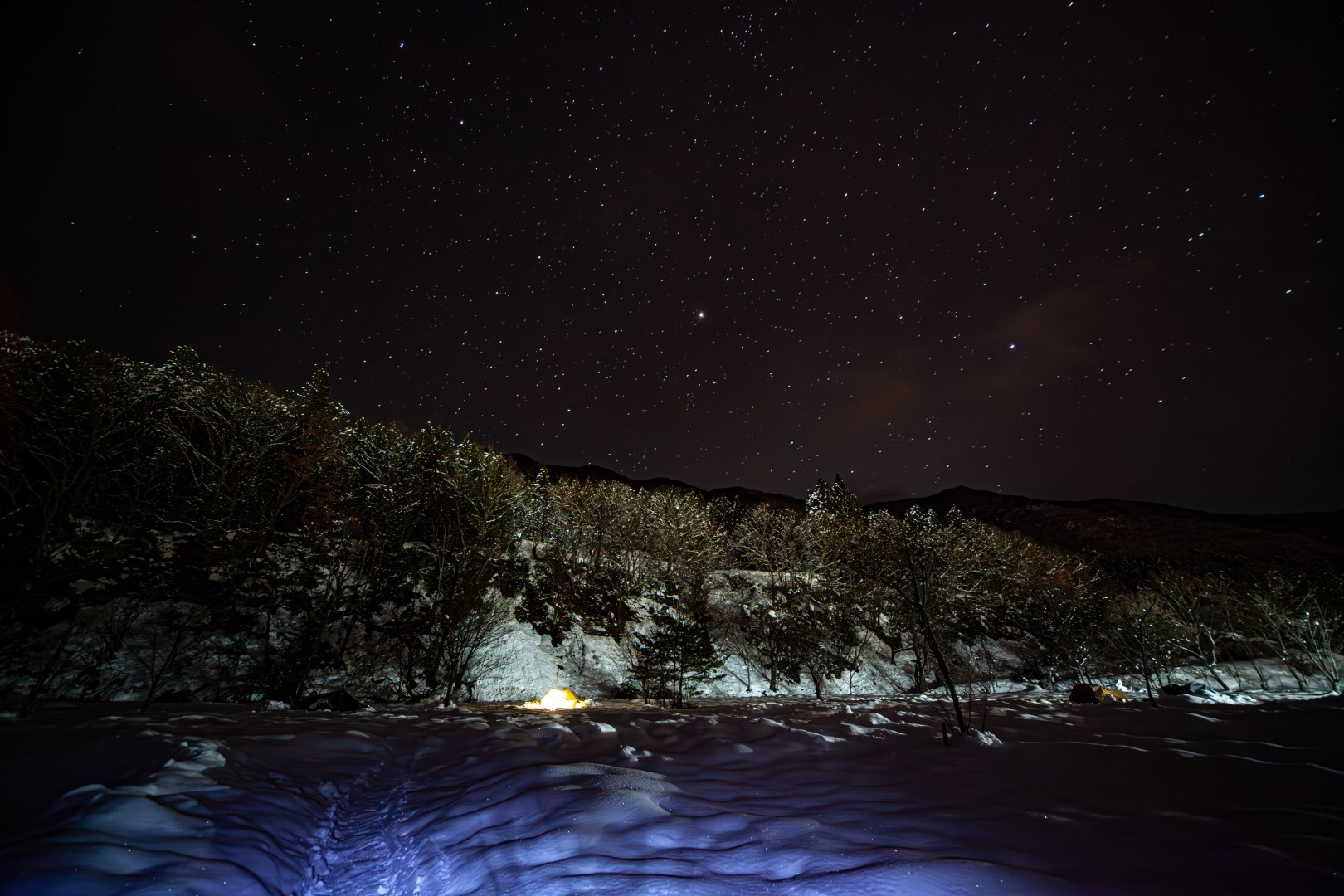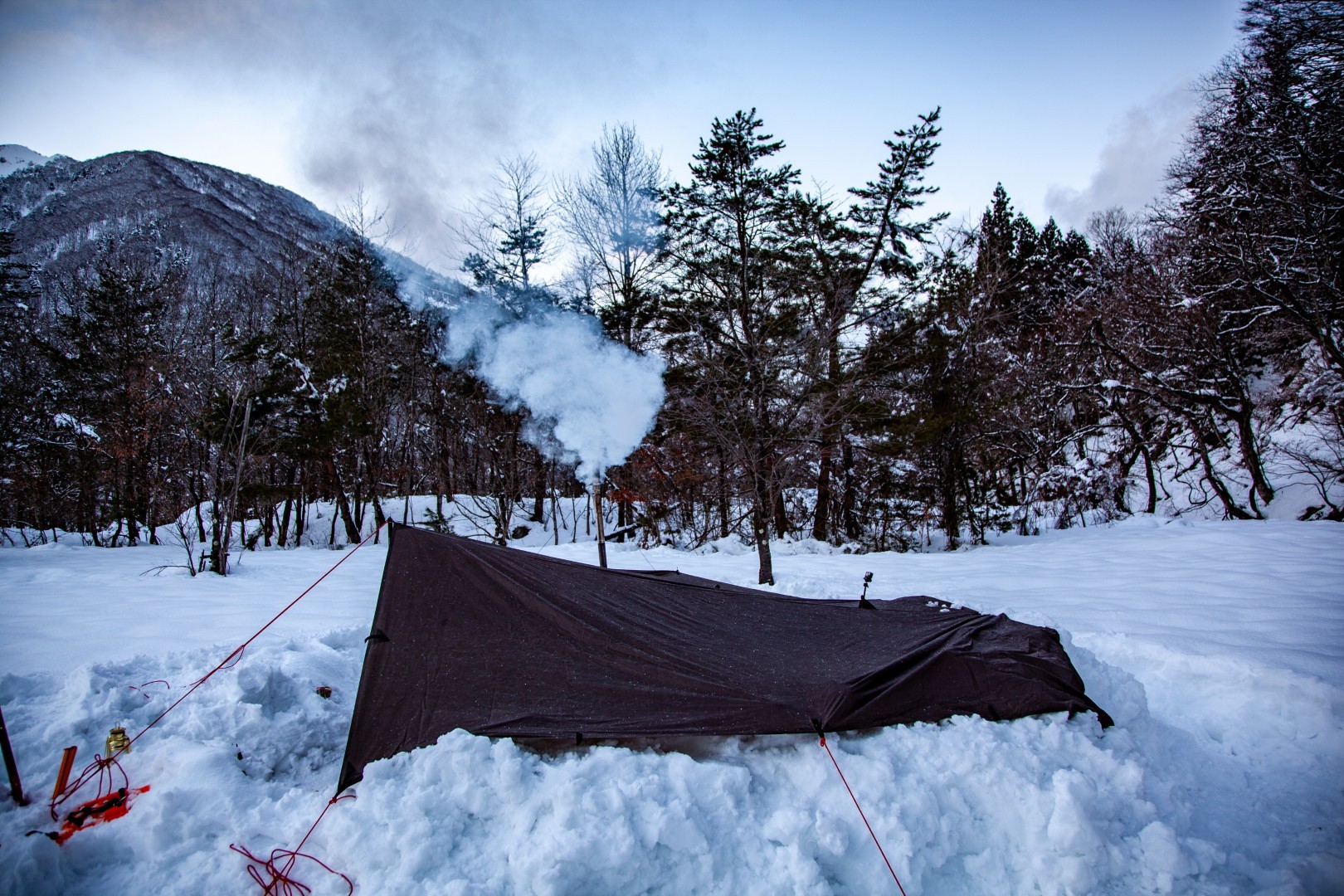 タープと半かまくらで作った寝床で過ごす一夜、薪ストーブの温もり、日本酒とキャンプ飯…冬ならではの静けさと絶景が心に沁みました。