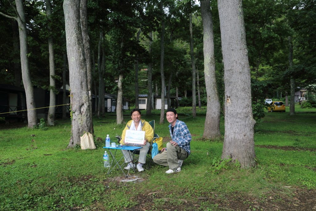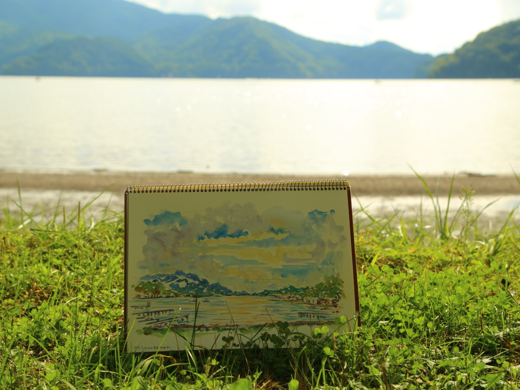ふとお隣さんを見ると本山さんが椅子に腰かけ湖を見ながら何やらしている。