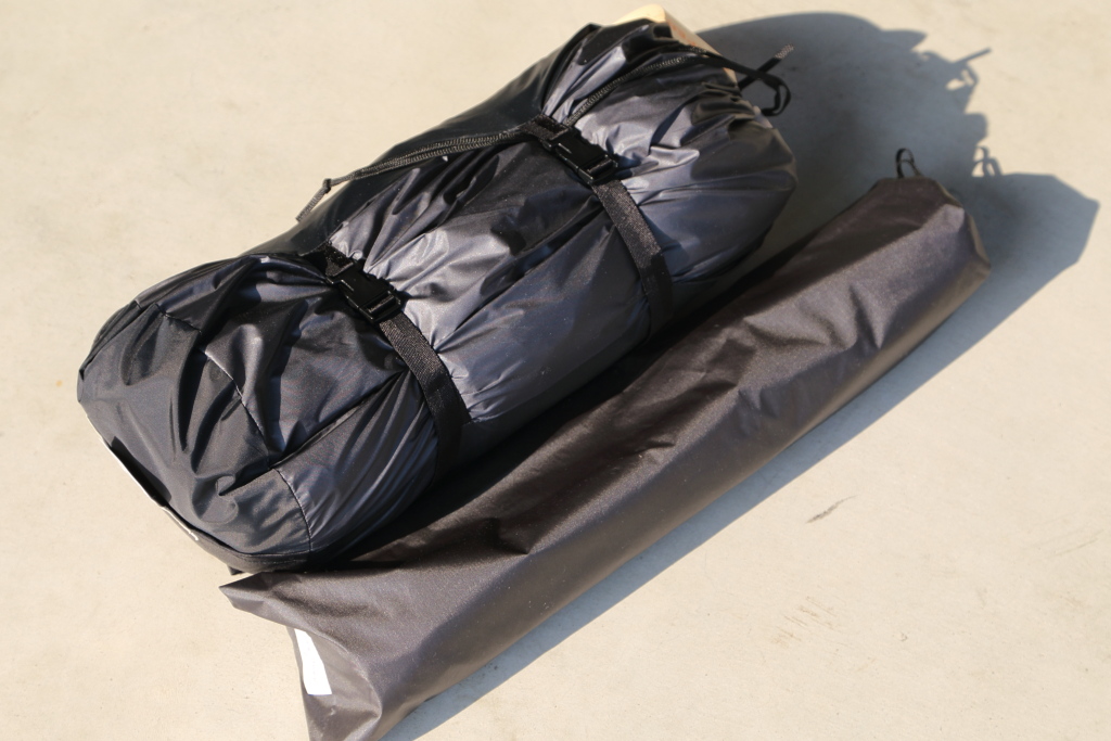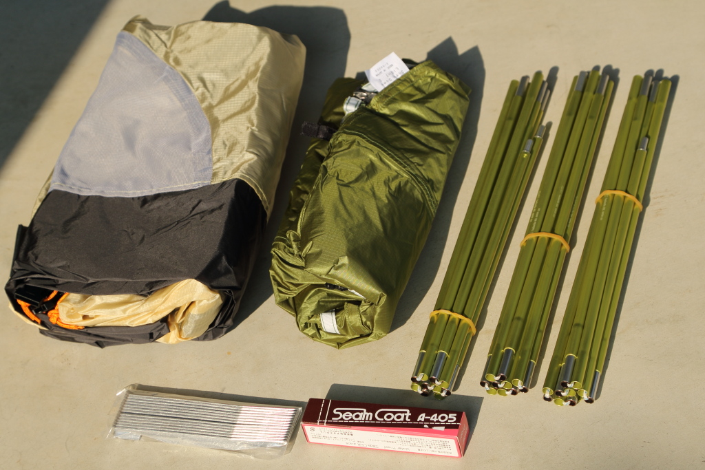 テント本体、フライシート、ポール(3本)、ペグ、シームコート。
