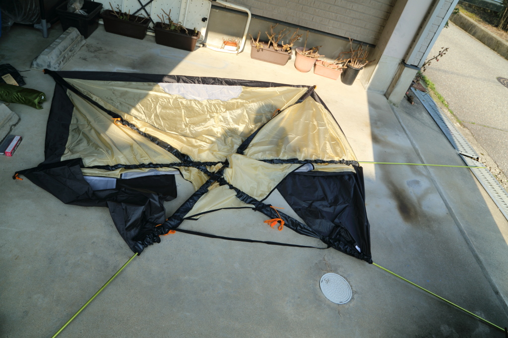 テントの四隅にシームコートを塗り防水処理。1時間くらいで乾いたのでフライシートを取り付けてみました。