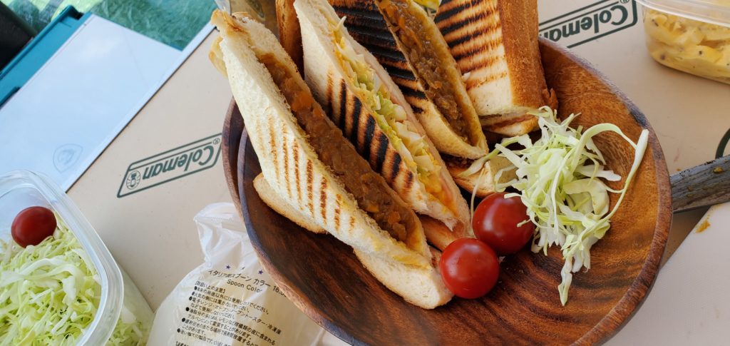 キャンプ飯は手作りカレーのホットサンド。焼き過ぎて焦げてしまった。