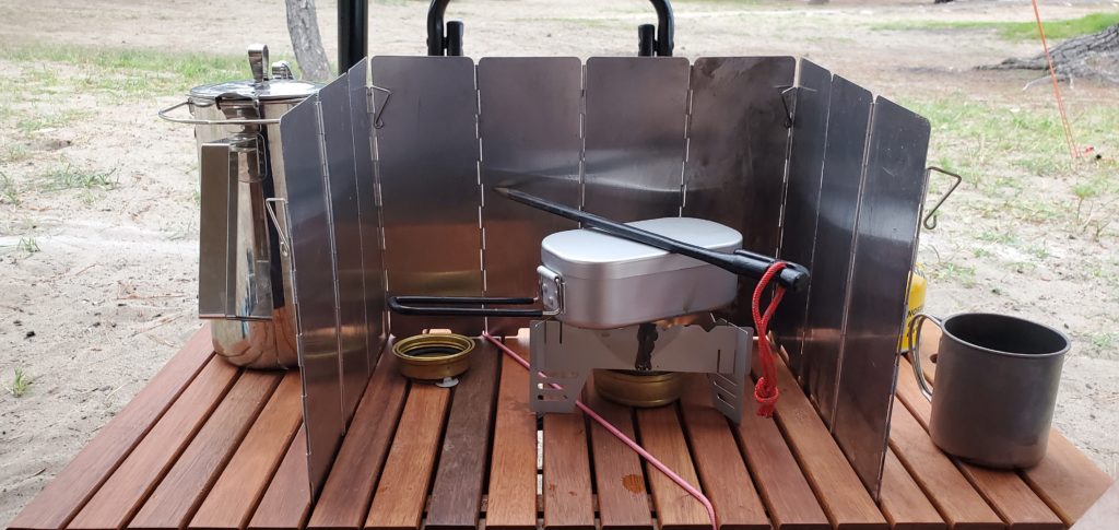 暗くなる前に晩御飯の準備。今回のキャンプ飯は、カップ麺とダイソーのメスティンで炊いたご飯。日本酒。バーナーはトランギアのアルコールバーナー。